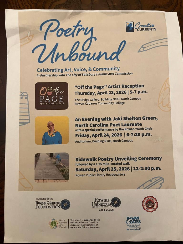 a Reception for the event was held this Thursday evening, … then, on Friday evening at the College Auditorium listening to the Salisbury Rowan Youth Choir… then, a special performance by North Carolina’s Poet Laureate Jaki Shelton Green! The weekend continued today, Saturday, April 25, 2026, with an induction of the eight Poets who won the awards for their Poems, and have these poems inscribed in the concrete cement grounds around the town of Salisbury, NC.
